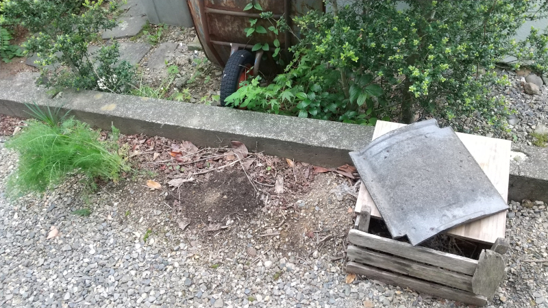 ベニシア・スタンリー・スミスさんの本を参考に、古いすのこで作ったコンポストも上手く活用できないまま劣化していましたが、「キエーロのようなもの」に設置替え。